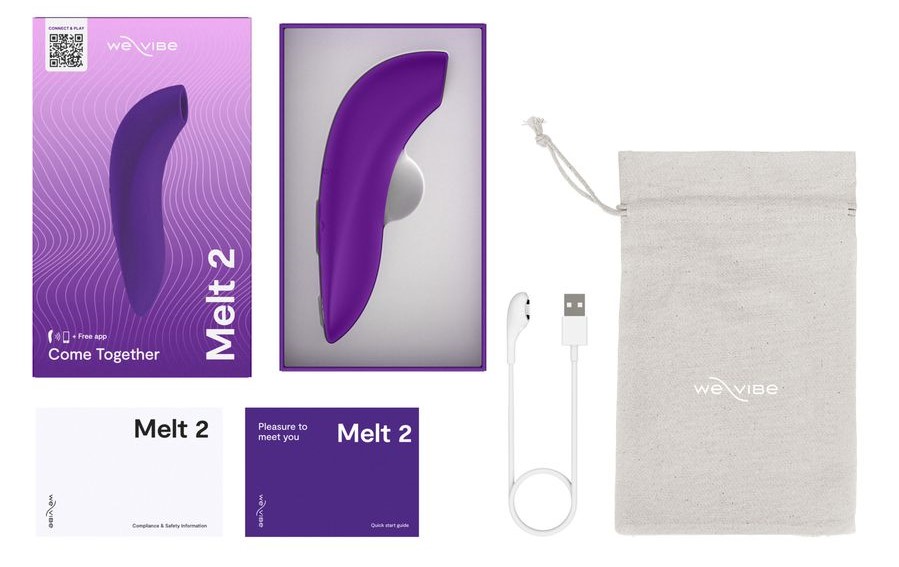 Комплектация: стимулятор клитора We-Vibe Melt 2, USB-кабель для зарядки через любой USB-порт (адаптер питания не входит в комплект), хлопковый мешочек для хранения, иллюстрированное многоязычное руководство по эксплуатации, инструкция по безопасности.