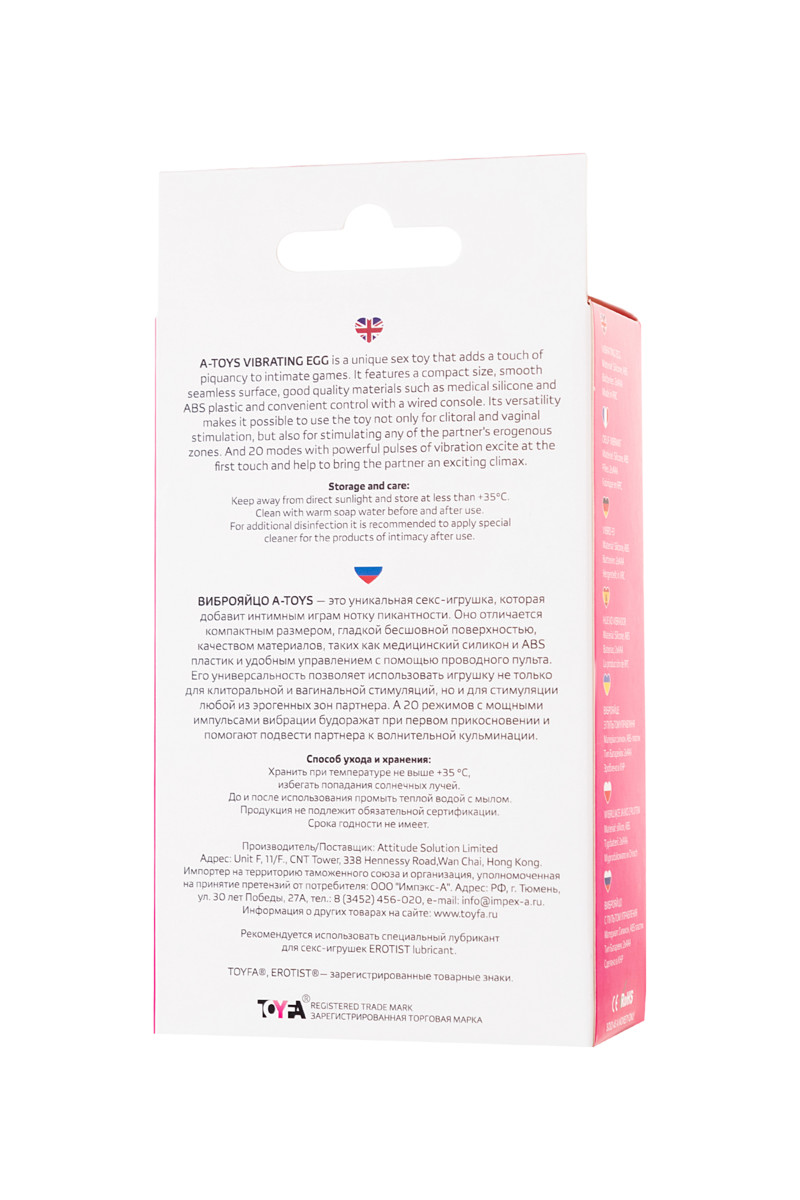 Виброяйцо A-Toys — это уникальная секс-игрушка, которая добавит интимным играм нотку пикантности. Оно отличается компактным размером, гладкой бесшовной поверхностью, качеством материалов, таких как медицинский силикон и ABS пластик и удобным управлением с помощью проводного пульта. Его универсальность позволяет использовать игрушку не только для клиторальной и вагинальной стимуляций, но и для стимуляции любой из эрогенных зон партнера. А 20 режимов с мощными импульсами вибрации будоражат при первом прикосновении и помогают подвести партнера к волнительной кульминации.